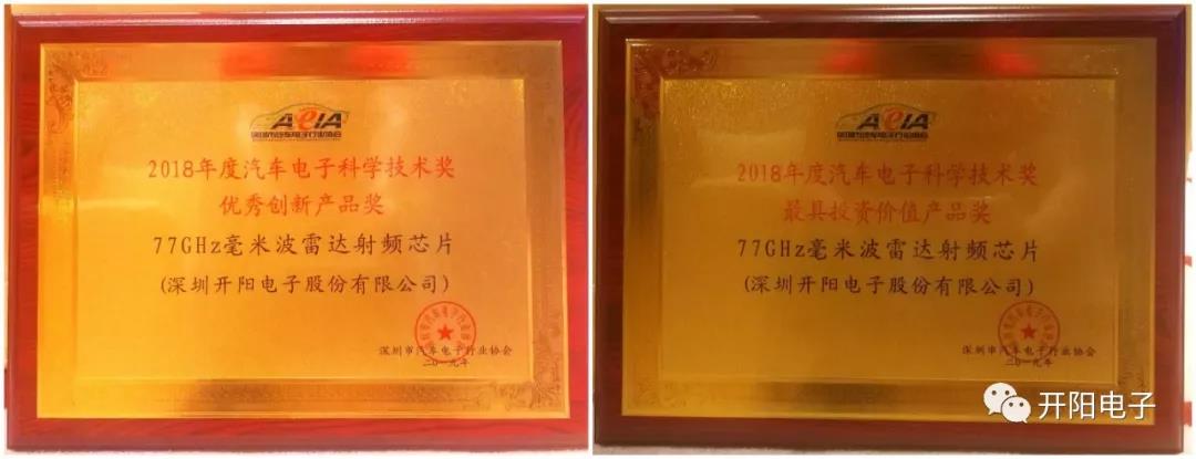 会上,开阳电子自主研发的“77GHz毫米波雷达射频芯片”一举获得两项中国汽车电子科学技术奖——“优秀创新产品奖”和“最具投资价值产品奖”。